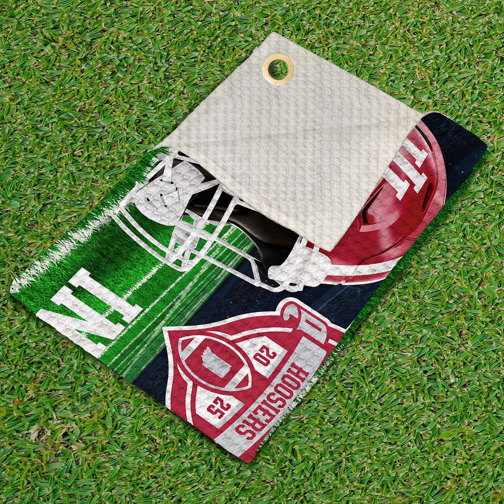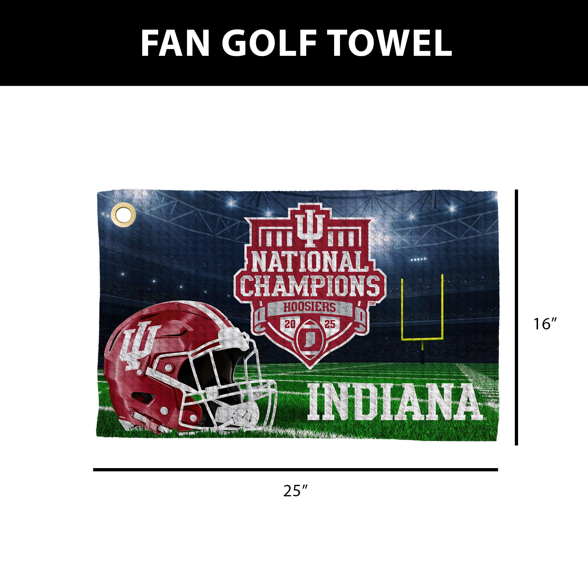 Bring championship intensity from the fairway to the final whistle with the Indiana Hoosiers NCAA 2025 FBC “Crunch Time” Waffle Fan Towel, designed for fans who carry Hoosier pride everywhere. An Officially Licensed design features a stadium-under-the-lights backdrop, bold “National Champions” Hoosiers crest, iconic helmet imagery, and undefeated season details, all showcased on textured waffle fabric that’s lightweight, absorbent, and quick-drying. The versatile waffle construction makes it just as useful for wiping clubs and golf balls as it is for waving in the stands. Perfect for the golf course, stadium, tailgates, watch parties, or fan caves, this towel delivers big-game energy in every setting. Easy to clip to a golf bag or tuck into a pocket, it’s a practical and spirited essential. Makes a great gift for Indiana fans, alumni, and collectors who want to represent Hoosiers pride whether it’s crunch time on the course or on game day.