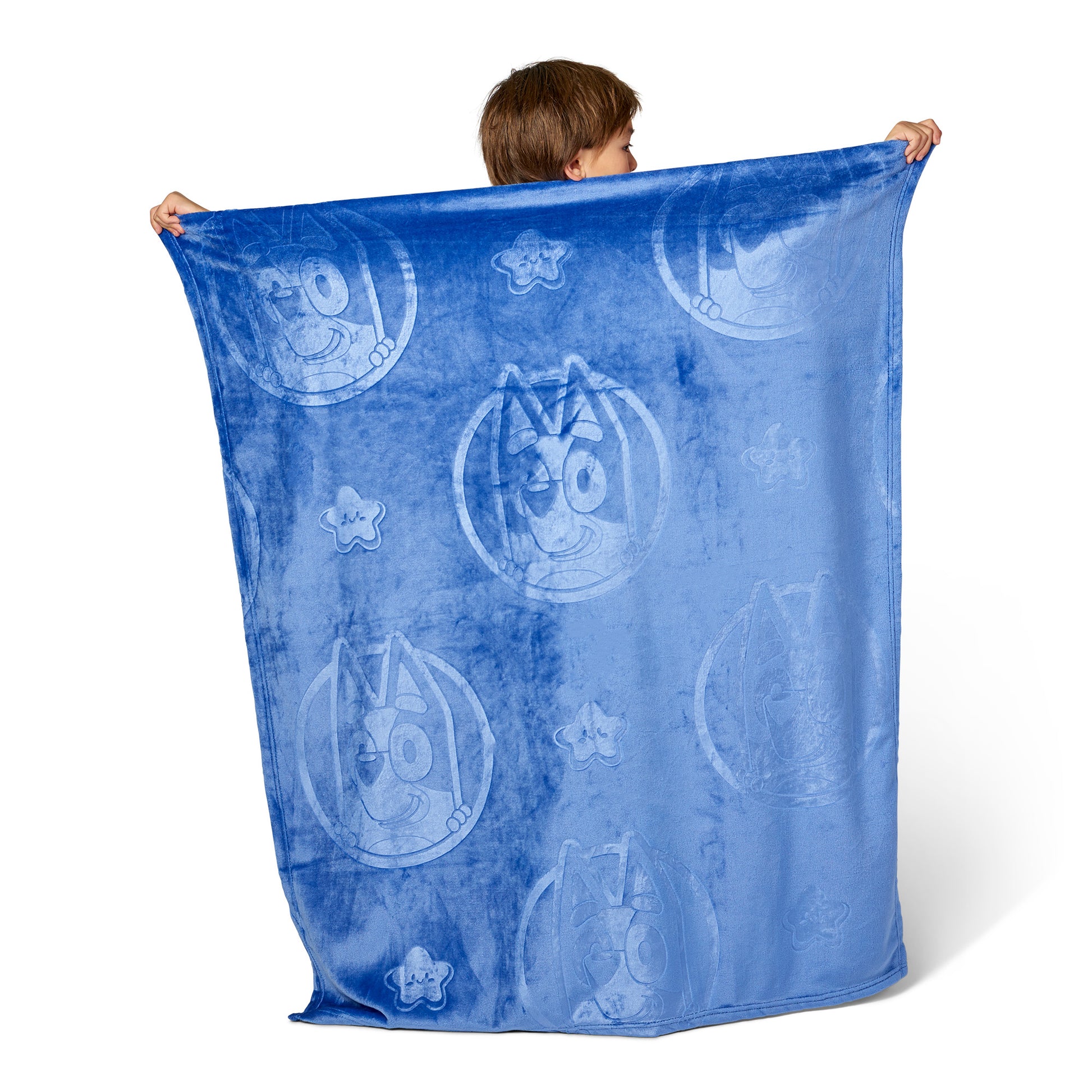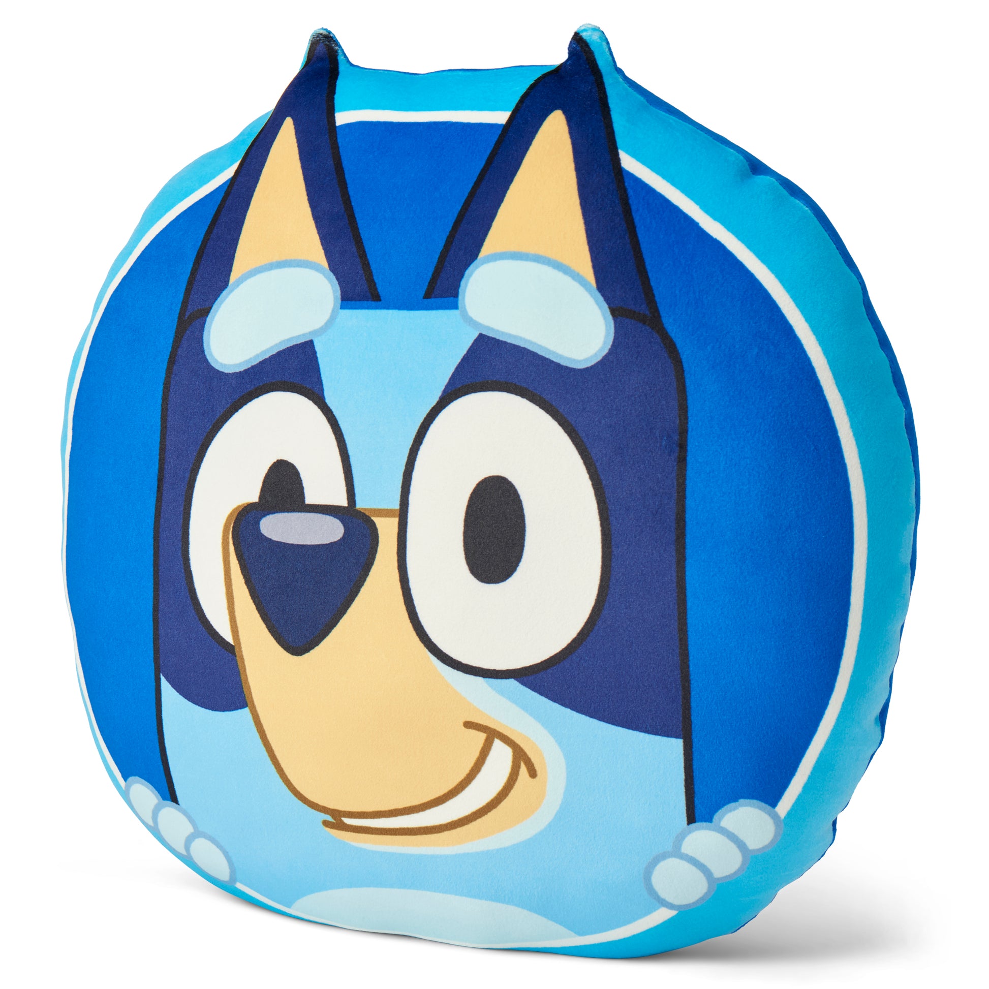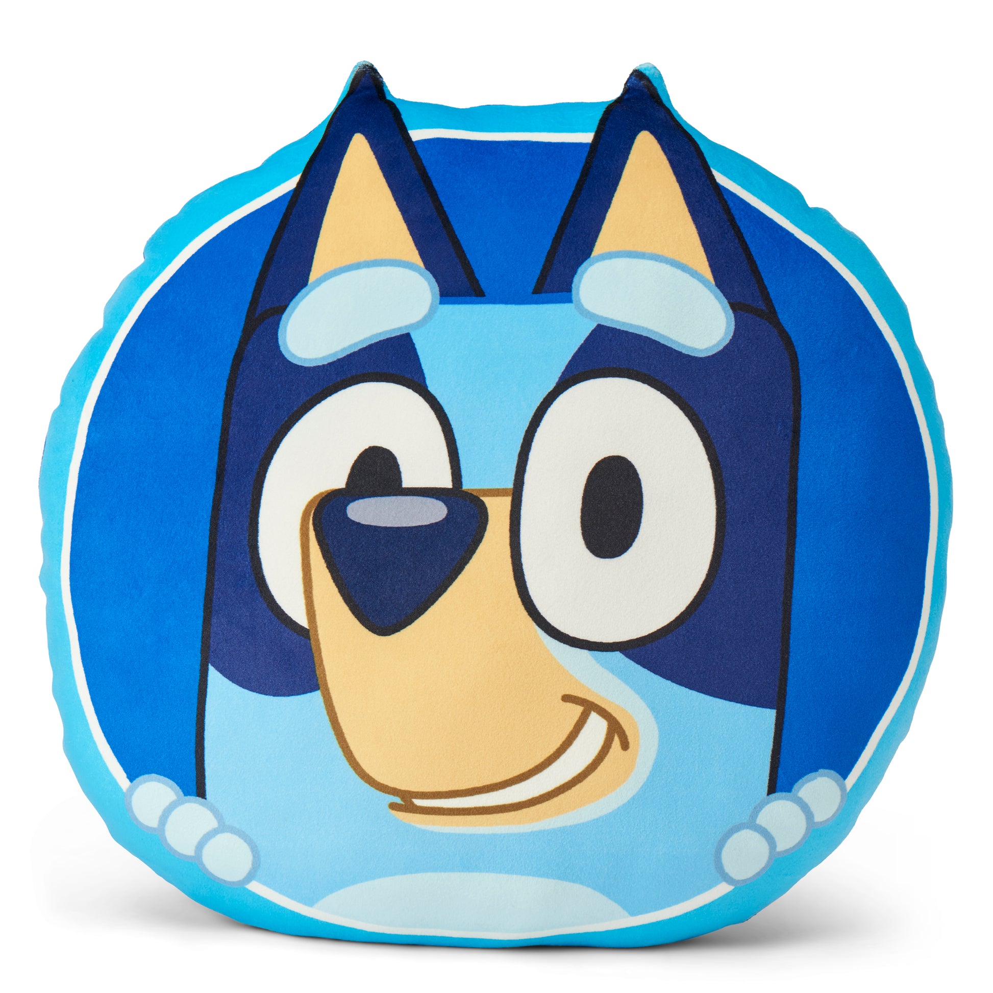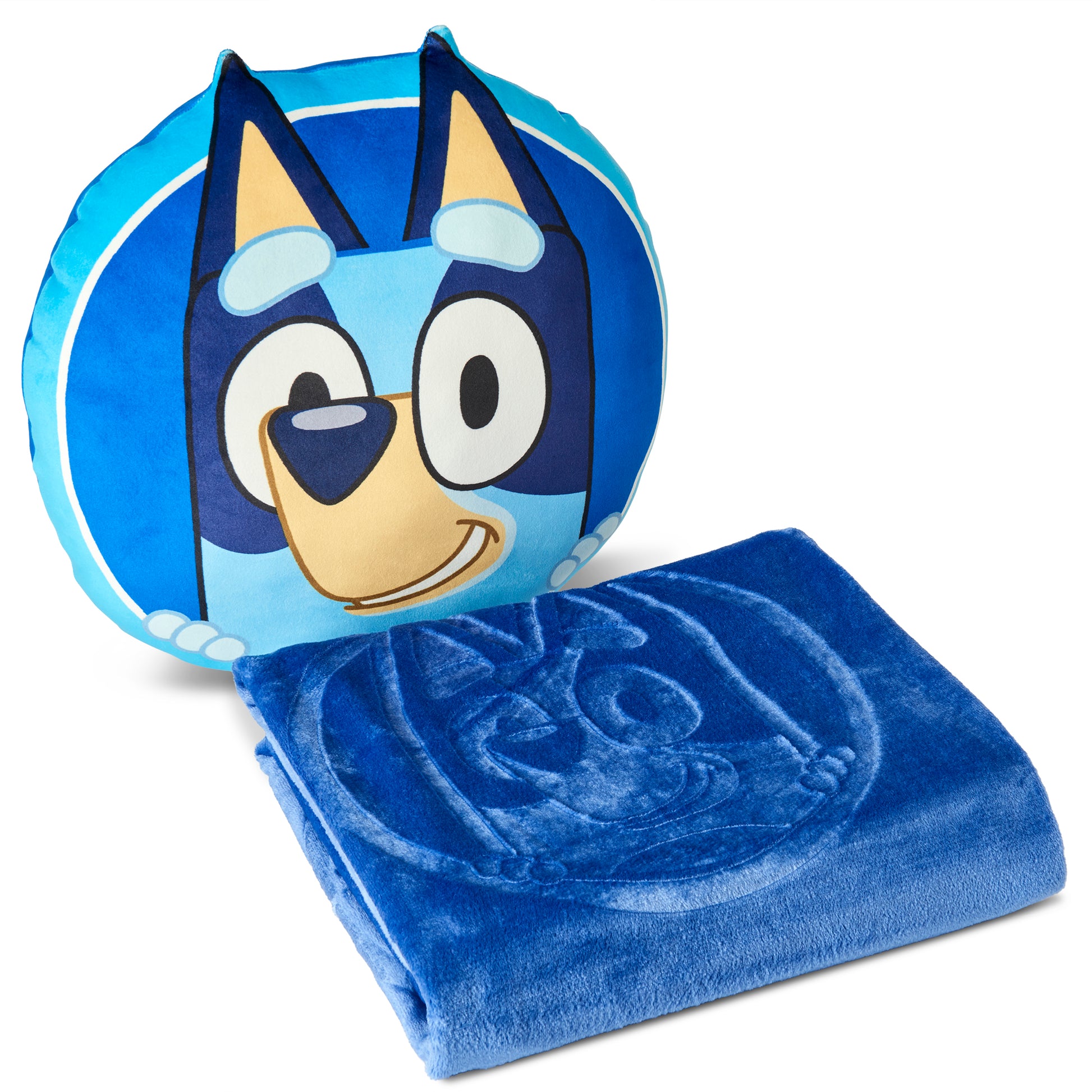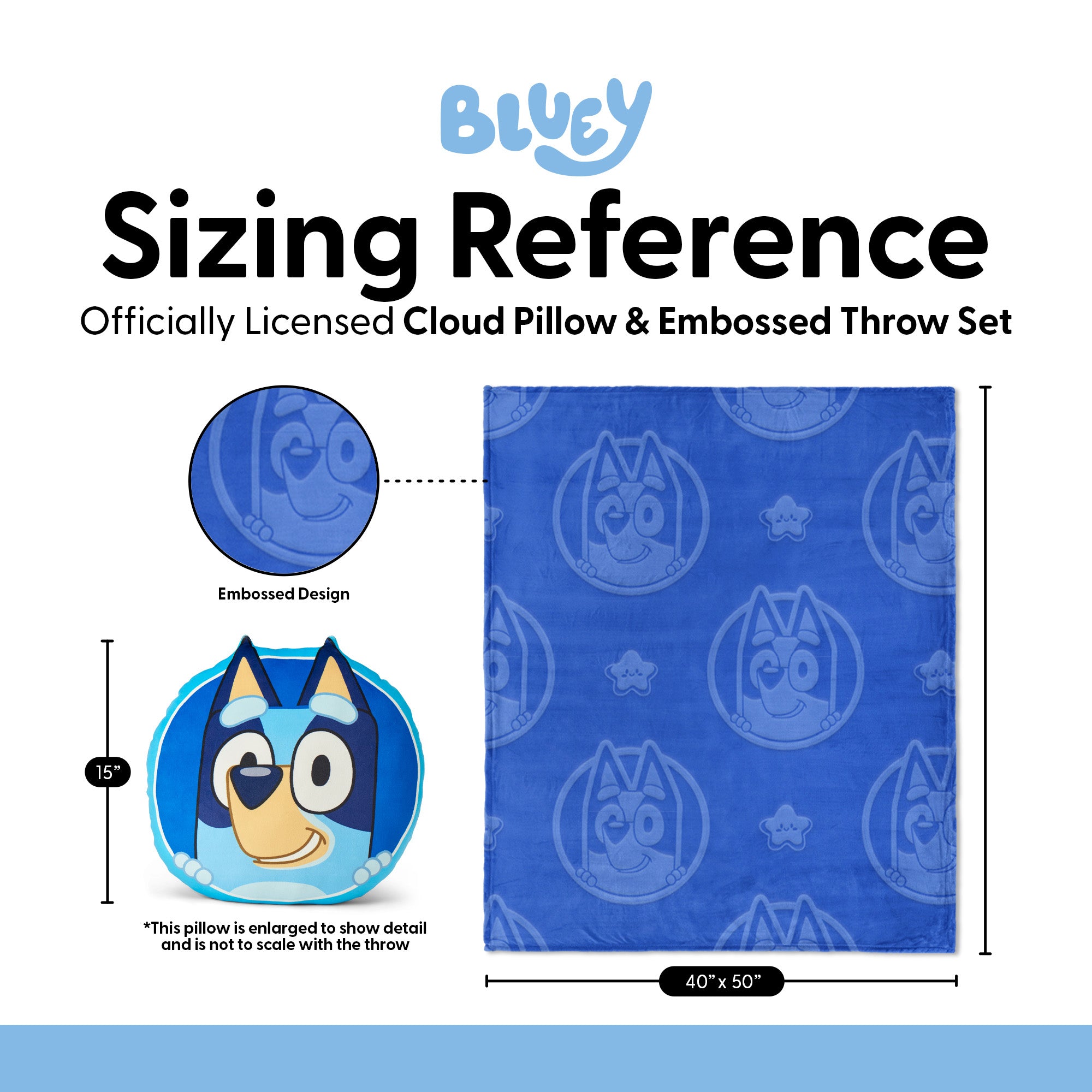 • Featuring everyone’s favorite blue heeler, this cozy set includes a plush round Cloud Pillow with Bluey’s happy face and a matching embossed throw in bright sky blue.