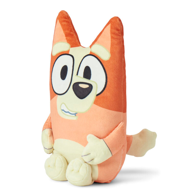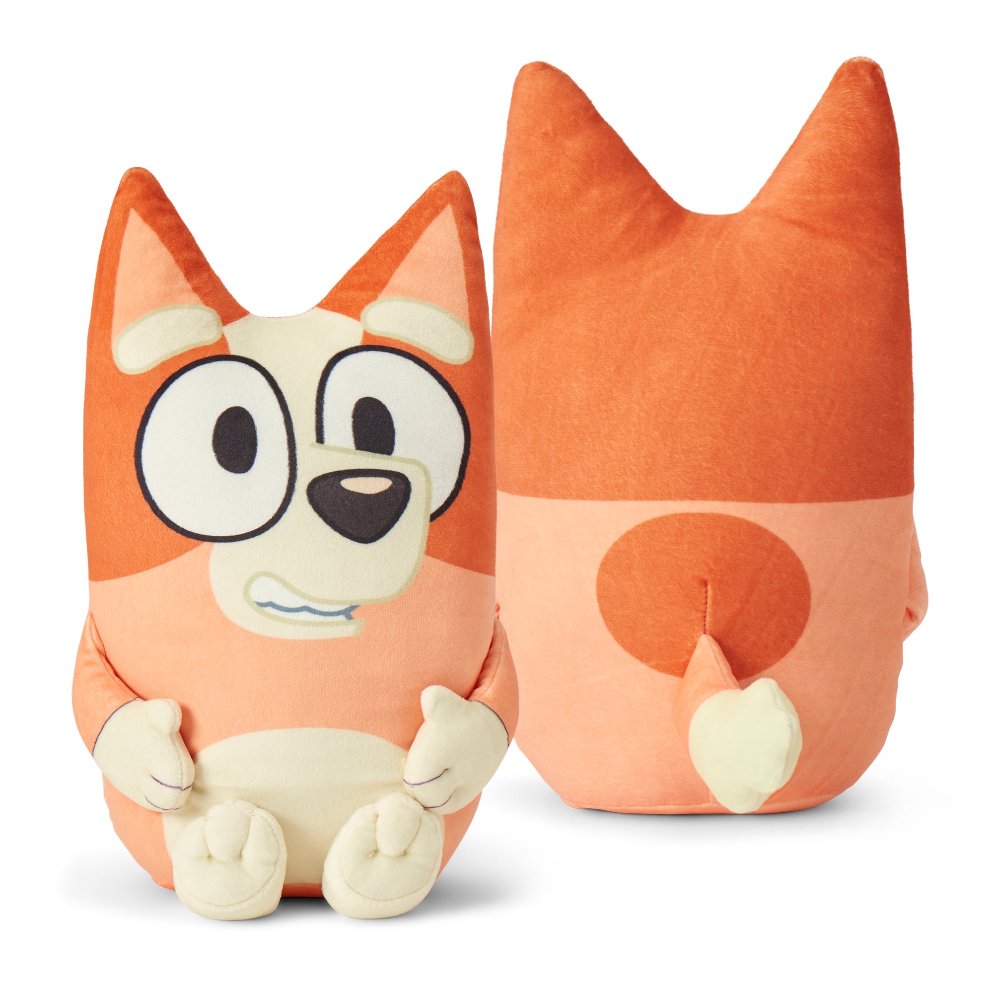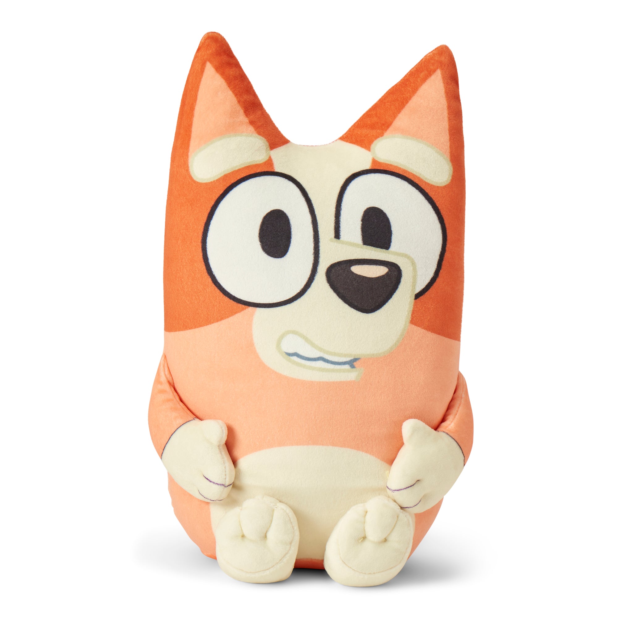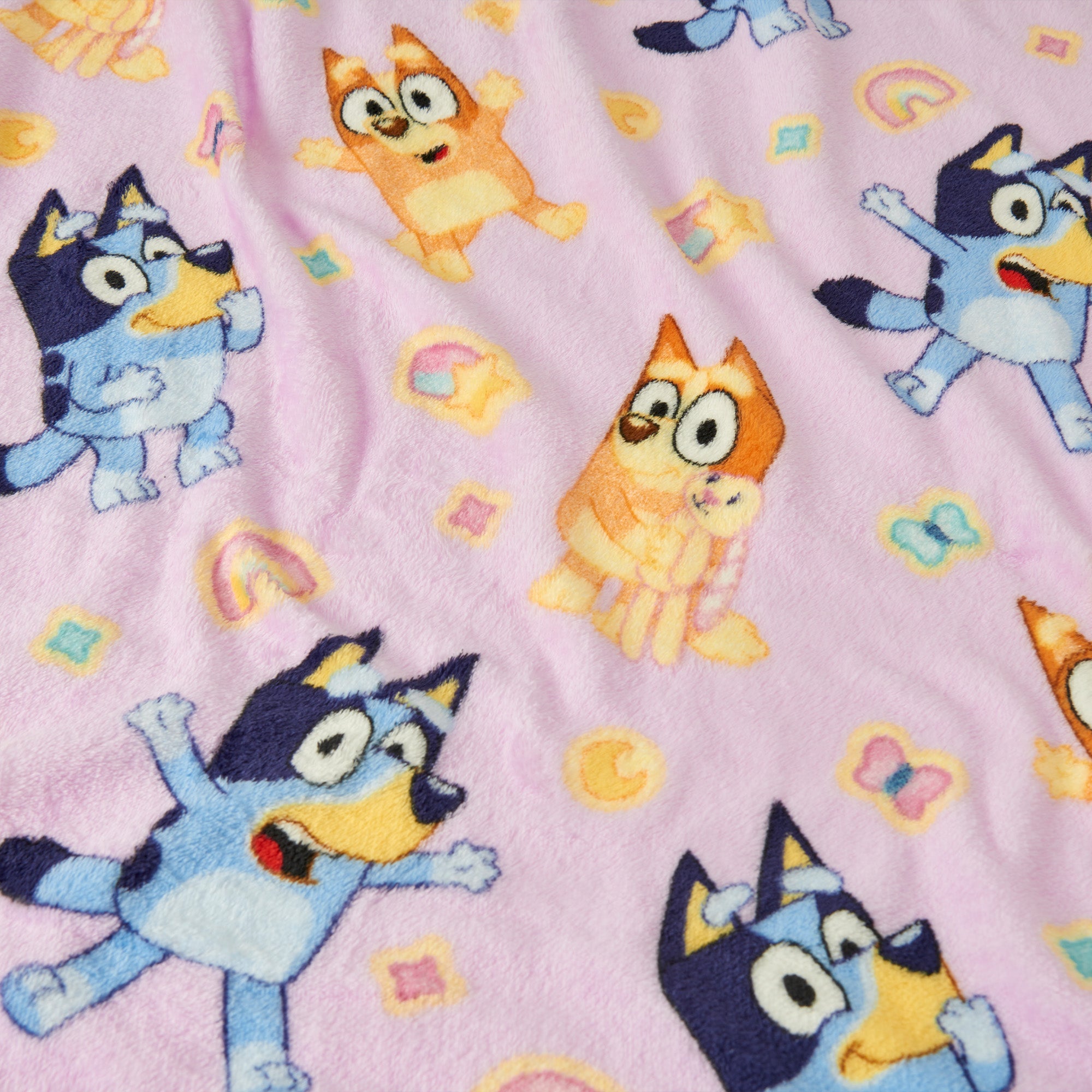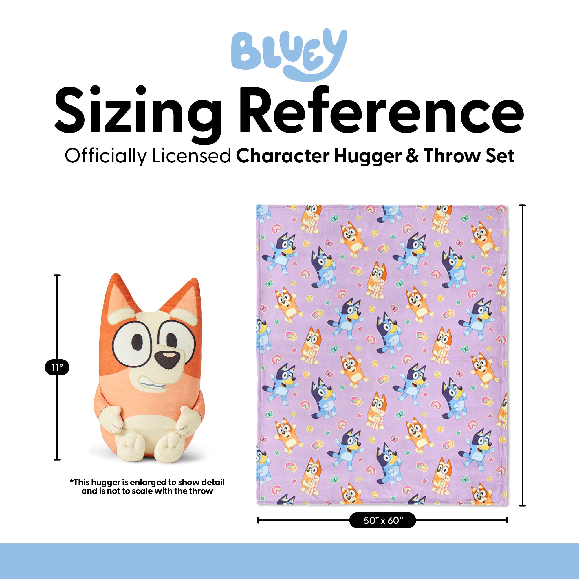 • Features Bluey and Bingo dancing across a cheerful lavender background sprinkled with colorful rainbows, stars, and hearts. Paired with a cuddly Bingo-shaped hugger pillow.