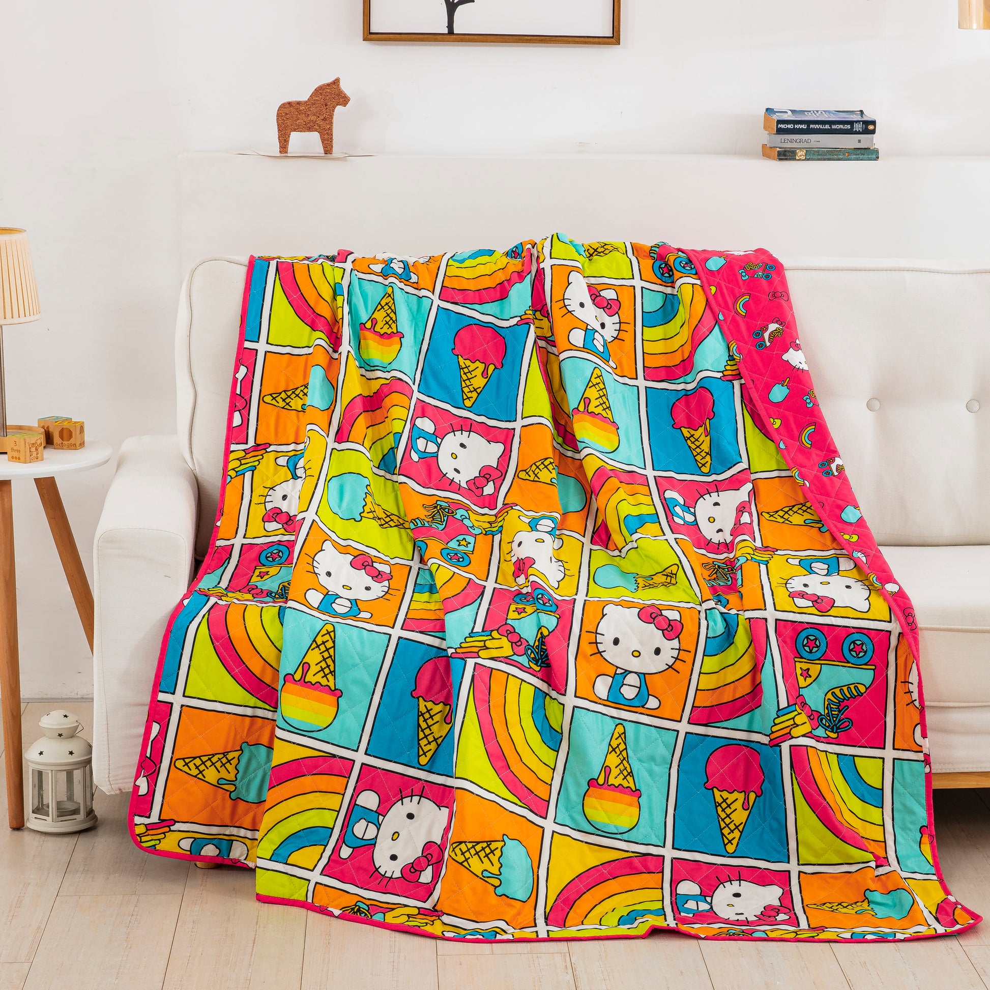 - Featuring Hello Kitty surrounded by playful elements like ice cream cones, rainbows, lollipops, and colorful bows, this blanket radiates joy and whimsy. The front showcases a vibrant grid of Hello Kitty in various poses, while the reverse side offers a lively design of Hello Kitty's face and sweet motifs.
