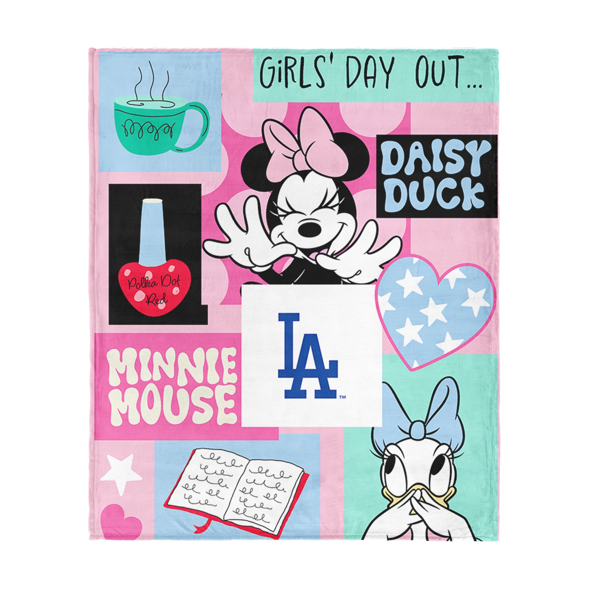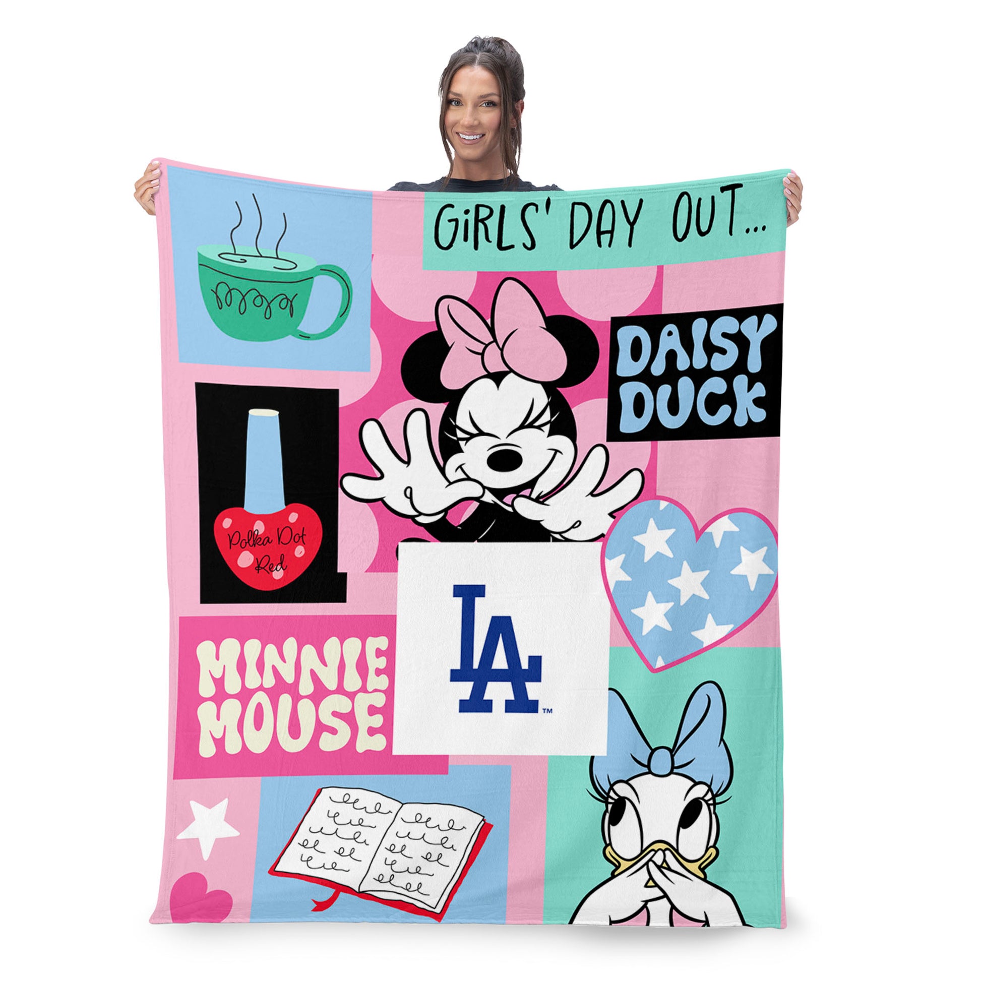 • Featuring a collage-style design of Minnie Mouse, Daisy Duck, cheerful graphic elements, and your favorite sport team's logo