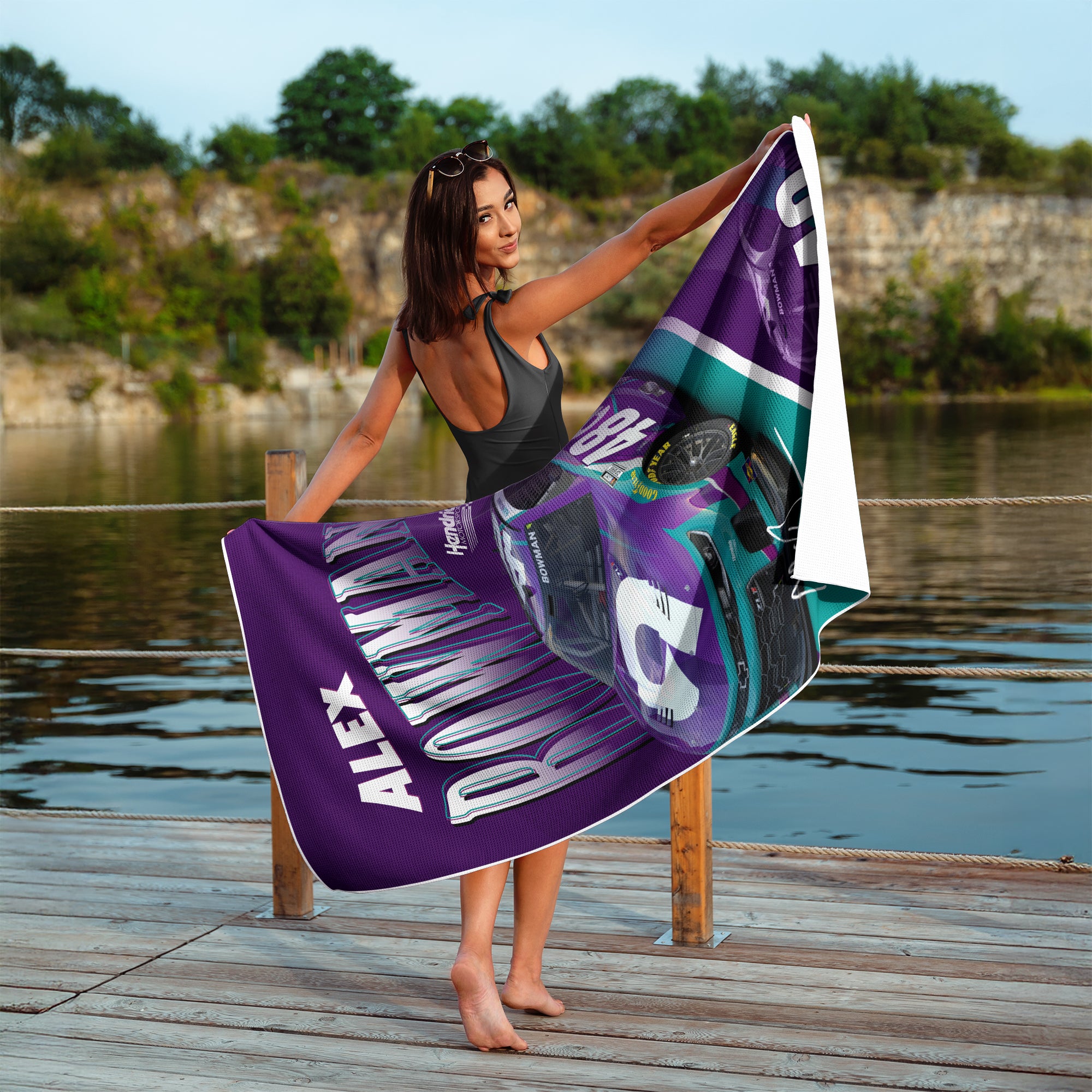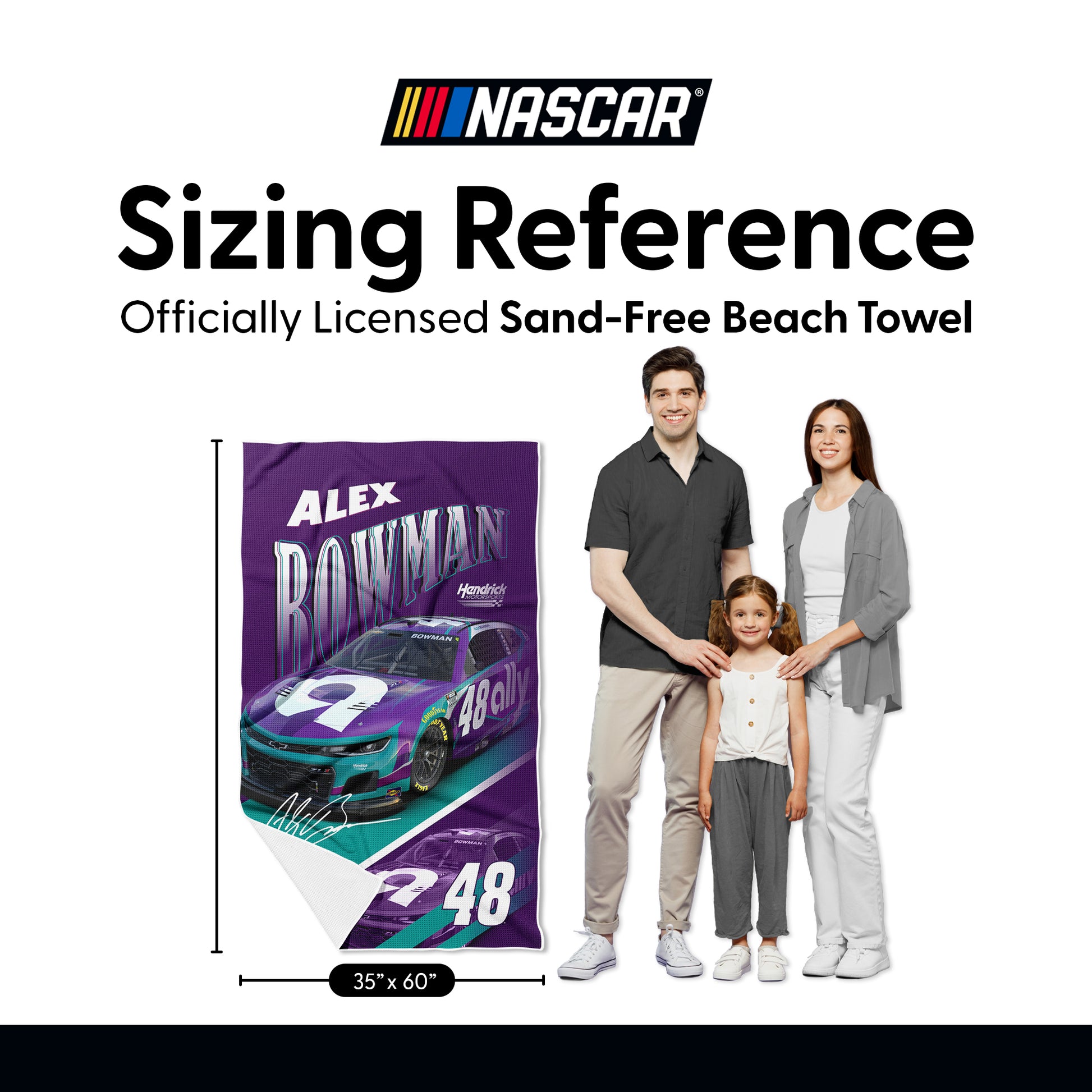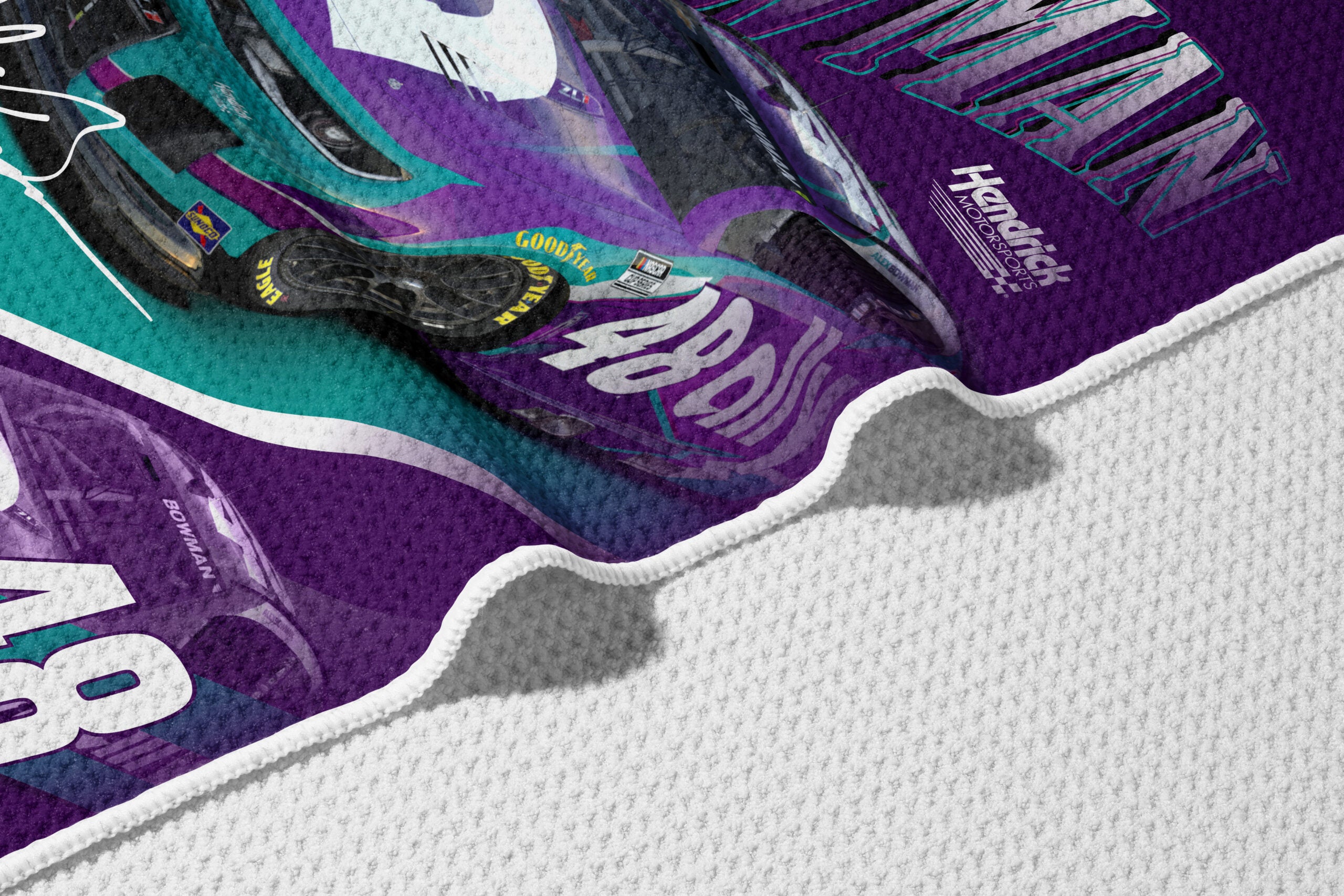Make waves with bold race-day style using the NASCAR Reflection Waffle Weave Beach Towel. Featuring a dynamic, high-impact design, this towel showcases your drivers name in oversized, dimensional lettering above a detailed image of his official racecar in signature colors. A mirrored reflection effect of the car and number adds depth and visual energy, creating a striking layout that captures the speed and intensity of NASCAR racing. Officially Licensed and built for true supporters, this beach towel makes a perfect addition to your summer essentials or a thoughtful gift for NASCAR fans of all ages.