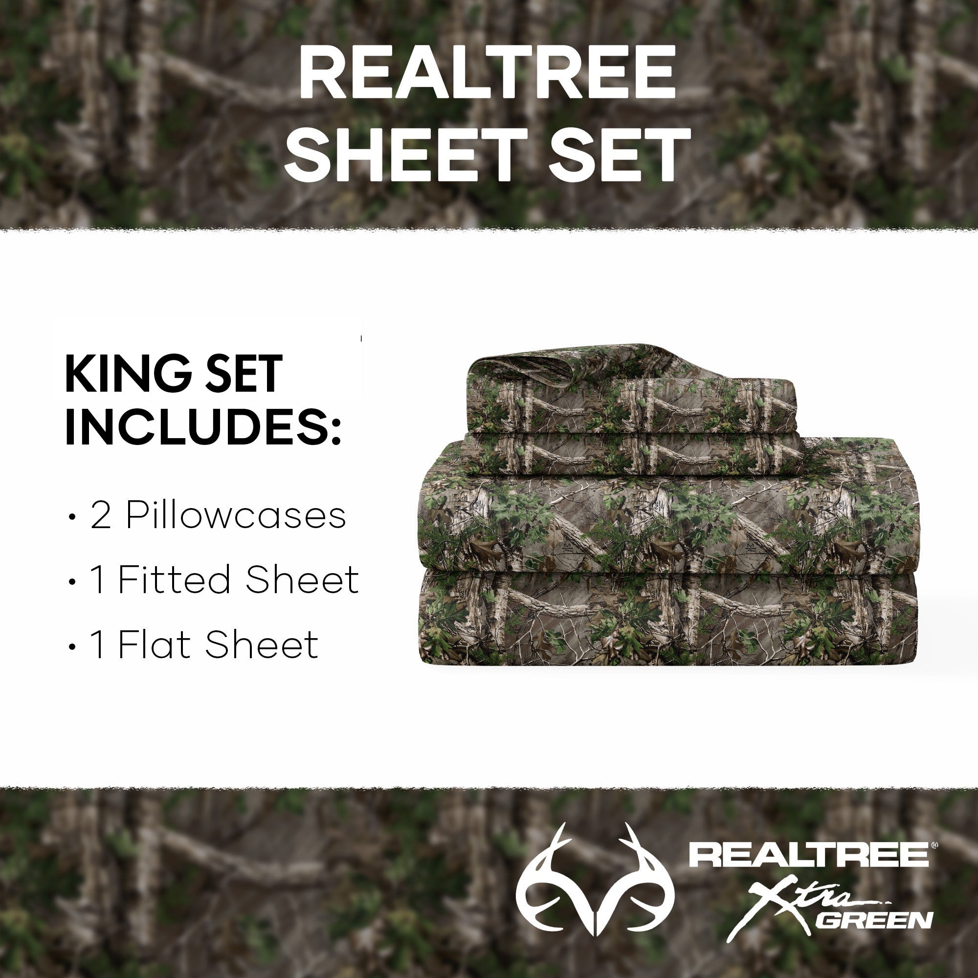 Drift off to sleep in this Realtree "Xtra Green Camo" 4-Piece King Sheet Set by TheNorthwest. You'll never want to get out of bed in the morning! Complete your bedding ensemble with this 4-piece queen king set featuring green leaves and trees in a repeating design. The pillowcases are coordinated to the sheets, with a large, bold logo. This set comes with one 105"x 102" flat sheet, one 80"x 78" fitted sheet with a 12" pocket, and two standard-size pillowcases (20"x 30") and fits most king sized beds.