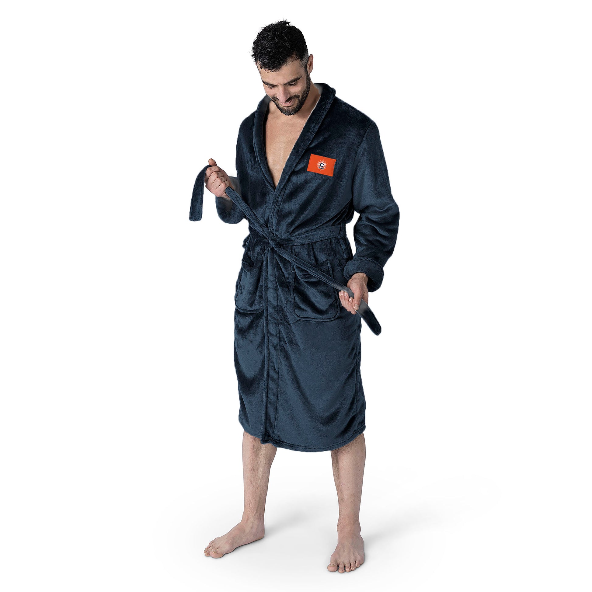 • Featuring ultra-soft silk-touch fabric, a cozy shawl collar, adjustable tie belt, roomy front pockets, and an embroidered team logo at the chest.
